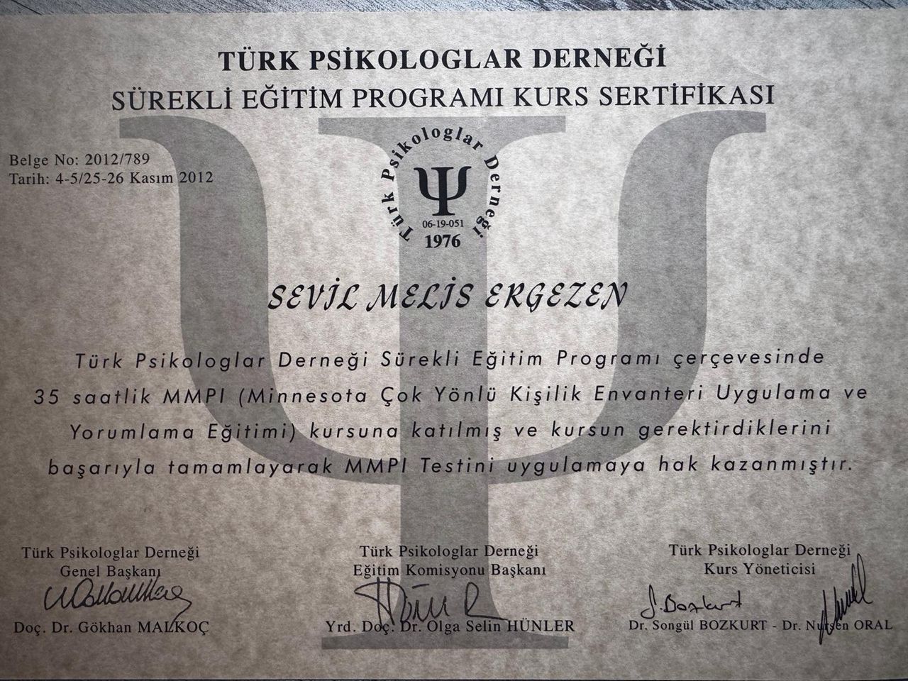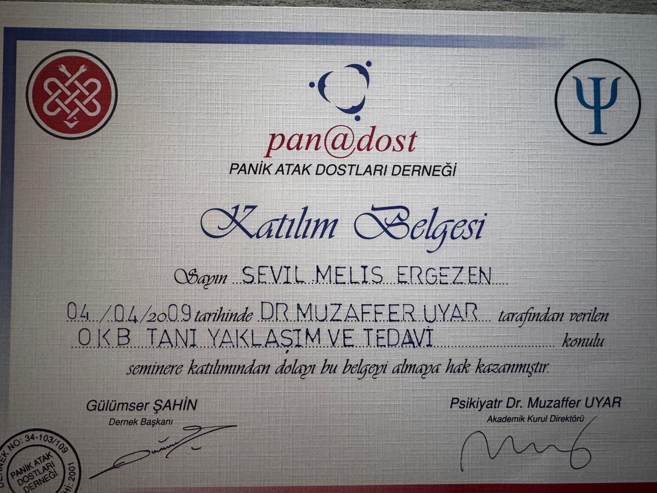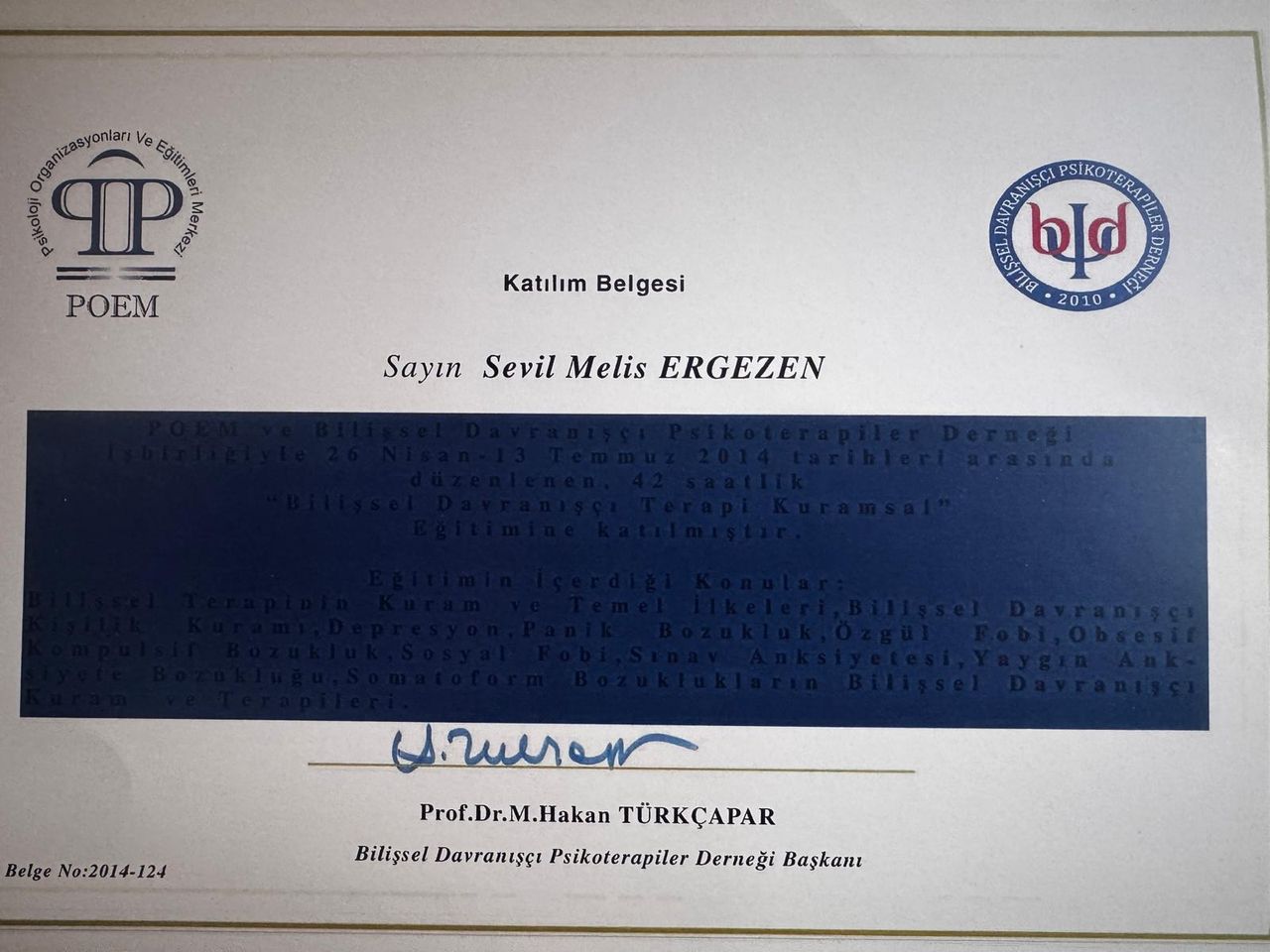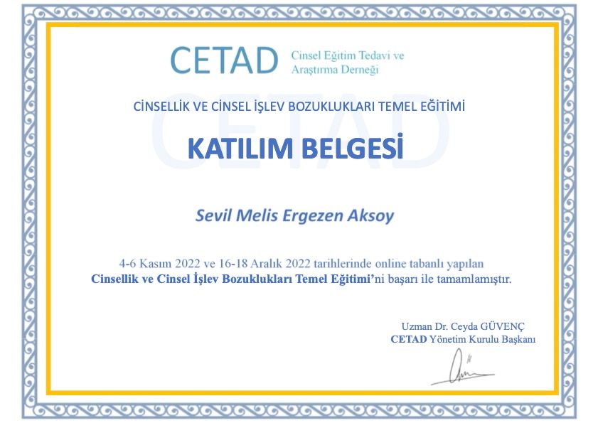 Yüksek lisans öğrenimim sırasında Prof. Dr. Hakan Türkçapar’dan Bilişsel (kognitif) Davranışçı Terapi (BDT), Yrd. Doç. Dr. Ahmet Emre Sargın'dan BDT süpervizyonu, Prof. Dr. Tevfika İkiz’den Rorschach Testi, Uzm. Psk. Emre Konuk’tan EMDR I. Düzey Uygulayıcı eğitimlerini aldım. İstanbul Psikoloji Okulu önderliğinde gerçekleştirilen Kişilik Bozuklukları Tanı ve Tedavi (Glen O. Gabbard, Otto F. Kernberg, Michaela Swales, Clara Mucci, Umberta Telfener, Paul Links) eğitimini, Cinsel Eğitim Tedavi ve Araştırma Derneği (CETAD) Cinsel İşlev Bozuklukları eğitimini aldım. Halen, Psikodinamik Yönelimli Psikoterapi Eğitimleri alanında Uzm. Klinik Psk. Suzan Uğur Girginer’den eğitim almakta ve bireysel süpervizyona devam etmekteyim.