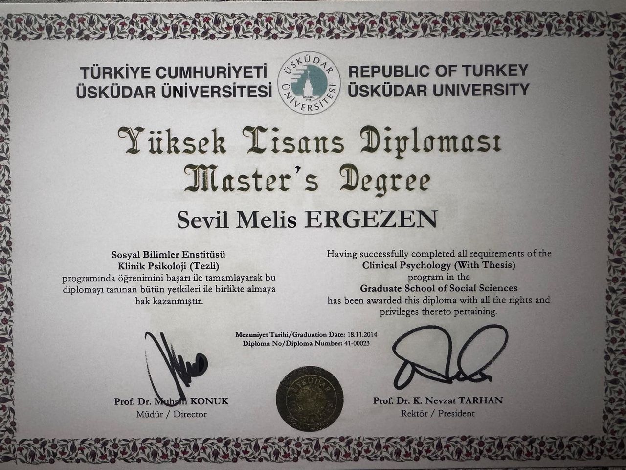 1989 yılında İstanbul'da doğdum. Lise eğitimini 2003-2007 yılları arasında T.E.B Ataşehir Anadolu Lisesi'nde tamamladıktan sonra 2012 yılında T.C Maltepe Üniversitesi Psikoloji bölümünü bitirip ardından 2014 yılında Üsküdar Üniversitesi tezli Klinik Psikoloji yüksek lisansını tamamladım.